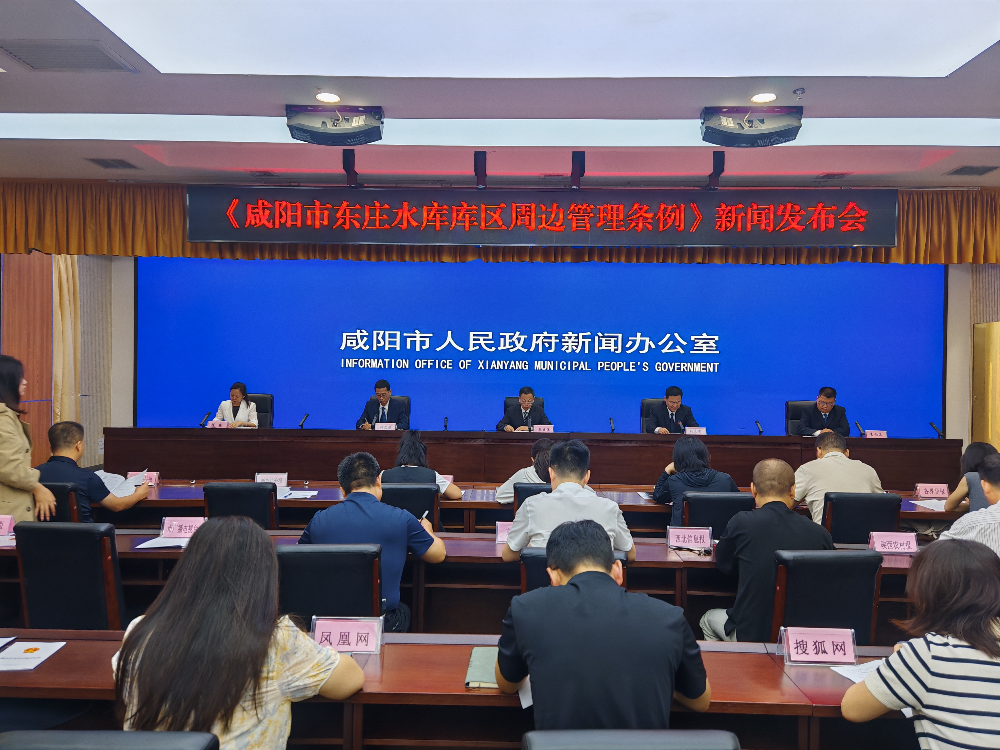 8月26日,咸阳市召开《咸阳市东庄水库库区周边管理条例》(以下简称《条例》)新闻发布会,市人大法制委主任委员、常委会法工委主任张云涛,市水利局党组书记、局长韩彦霄,市生态环境局督察专员许文斌,市自然资源局党组成员、副局长李向卫出席会议,向新闻媒体介绍《条例》制定背景、核心内容及实施保障举措并答记者问。该《条例》将于 2025 年 9 月 1 日起正式施行,对于完善咸阳市水利工程管理法规体系、提升库区现代化治理水平、推动泾河流域绿色发展具有重要意义。
