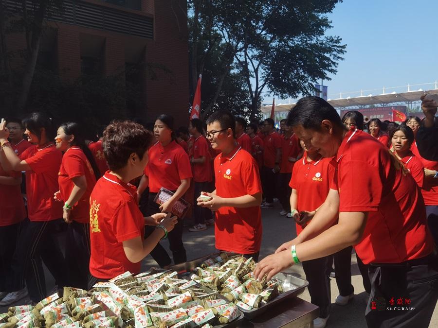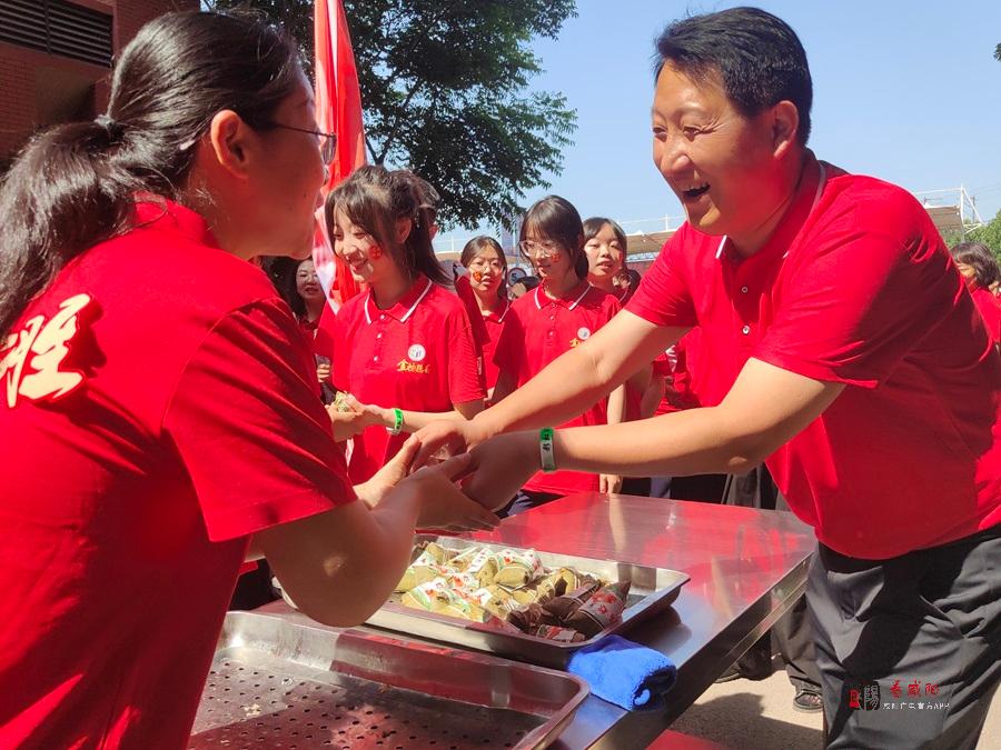 十年砺剑今日策马闯雄关,一朝试锋六月扬眉凯歌旋。咸阳彩虹中学执行校长高辉拿着话筒站在领跑指定位置,一声令下:“勇士们,向着胜利,出征!”全体高三学子迅速整队,在体育老师的指挥下,迈着坚定的步伐,向着终点跑去。校领导与高三年级老师在胜利门为学生们发放粽子,寓意着“一举高‘粽’”,祝愿考生们高考顺利,金榜题名。