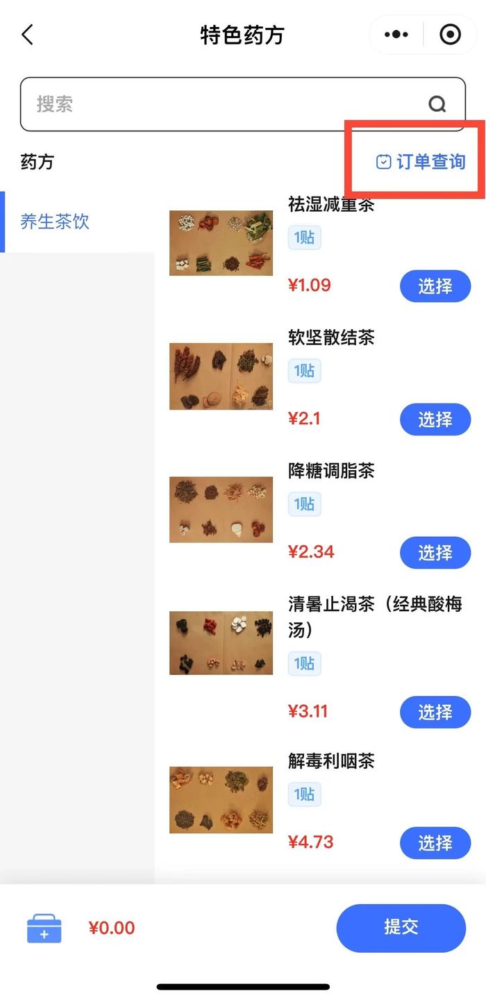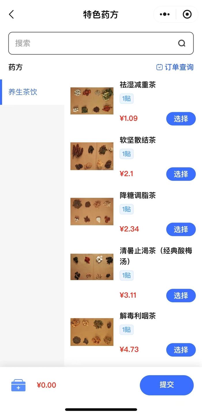 2.点击【养生茶饮】按需选择,并阅读药方详情;