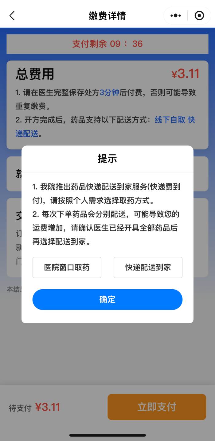 5.支付时可选择医院窗口自取或快递到家(快递为邮政到付)。