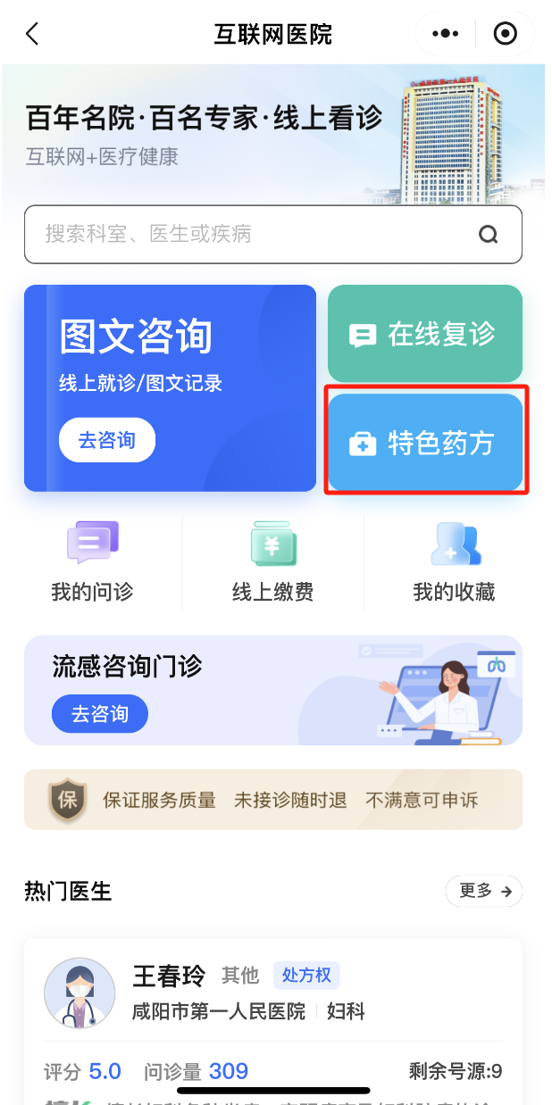 1.扫描上方二维码进入【特色药方】,或从咸阳市第一人民医院互联网医院主页选择【特色药方】。进入后请详细阅读温馨提醒;