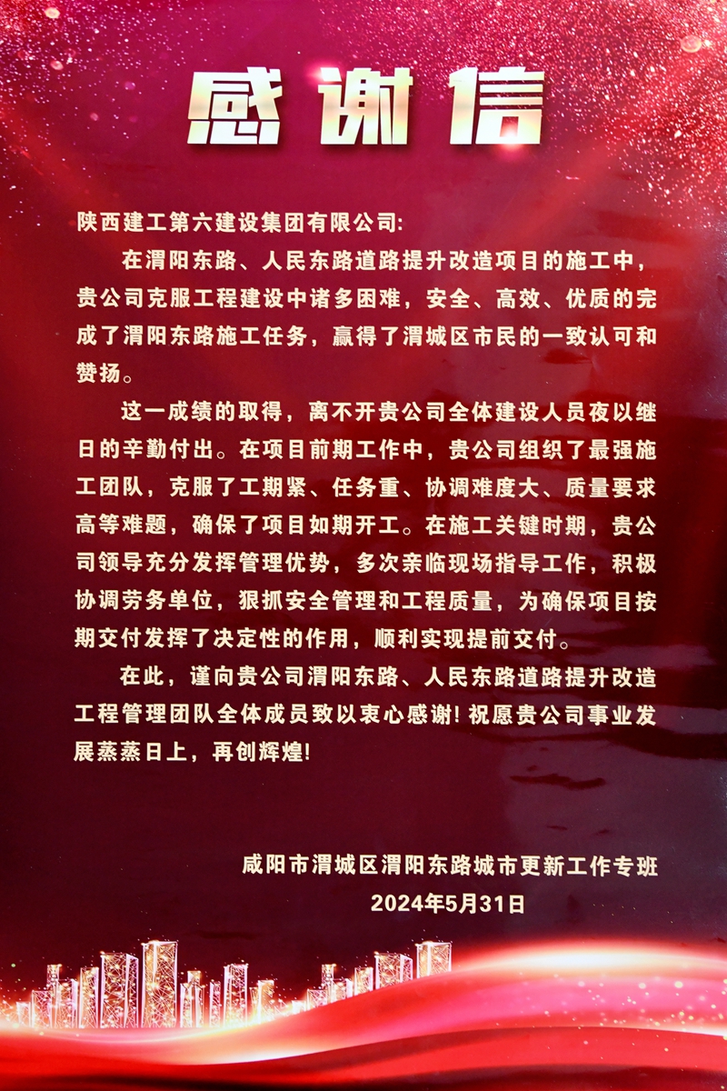 工作专班在感谢信中表示:在渭阳东路、人民东路道路提升改造项目的施工中,陕西建工第六建设集团有限公司克服工程建设中诸多困难,安全、高效、优质地完成了渭阳东路施工任务,赢得了渭城区市民的一致认可和赞扬。这一成绩的取得,离不开公司全体建设人员夜以继日的辛勤付出。在项目前期工作中,公司组织了最强施工团队,克服了工期紧、任务重、协调难度大、质量要求高等难题,确保了项目如期开工。在施工关键时期,公司领导充分发挥管理优势,多次亲临现场指导工作,积极协调劳务单位,狠抓安全管理和工程质量,为确保项目按期交付发挥了决定性的作用,顺利实现提前交付。在此,谨向公司渭阳东路、人民东路道路提升改造工程管理团队全体成员致以衷心感谢!祝愿公司事业发展蒸蒸日上,再创辉煌!