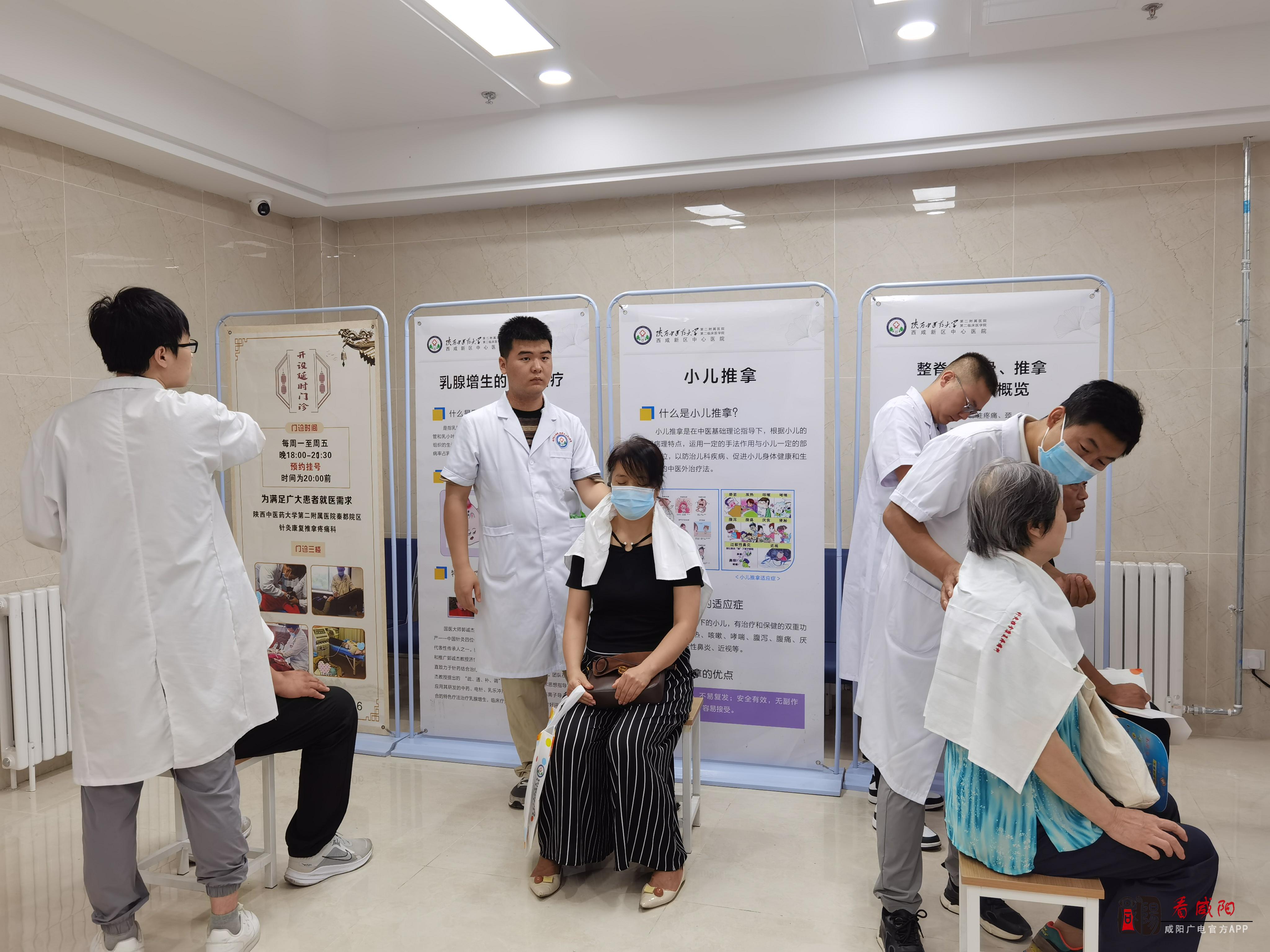 在义诊活动中,医护人员在门诊楼外搭起了义诊桌椅,摆满了各式各样的中医器具、特色产品、院内制剂。市民们争相体验耳部铜砭刮痧、扶阳罐温刮温推、中医经络检测等项目。天气炎热,药剂科的工作人员也把陕中二附院火爆网络、一剂难求的“酸梅汤”给大家免费安排,受到了广大市民的喜爱。