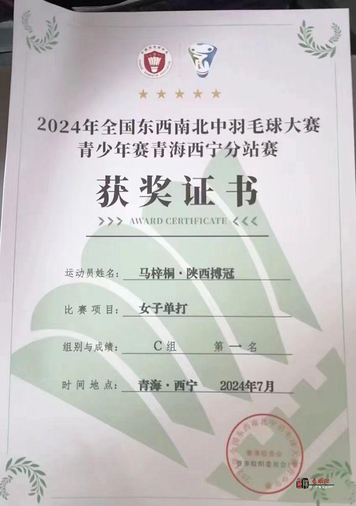 《看咸阳》讯:近日,由中国羽毛球协会主办的全国东西南北中青少年羽毛球大赛在青海省西宁市圆满举办。来自陕西咸阳搏冠俱乐部队的青少年羽毛球女子运动员马梓桐表现抢眼,一路过关斩将,凭借精湛的球技和顽强的斗志,一举夺得青少年女子11岁C组的冠军。