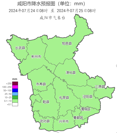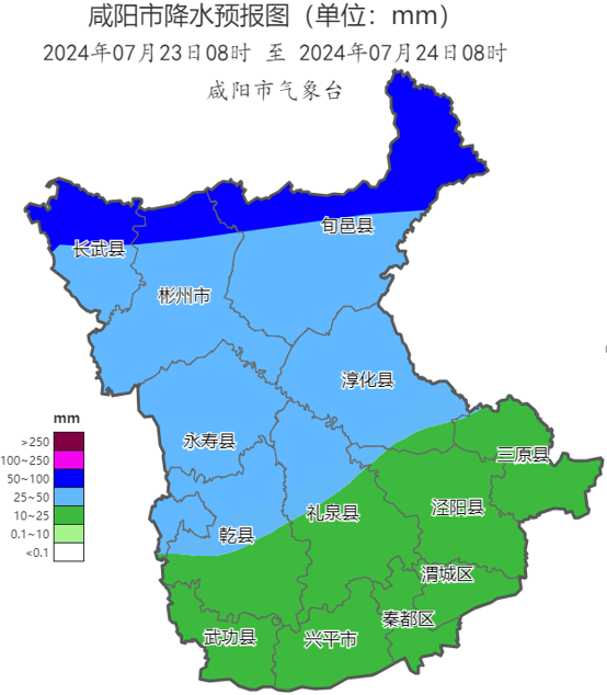 《看咸阳》讯:据最新气象预报,本周我市多对流性天气,7月23—24日,全市有一次强降水天气过程,南部县区中到大雨,北部县区大雨,局地暴雨,过程期间伴有短时暴雨、雷暴大风等强对流天气,最大小时雨强20~40mm。