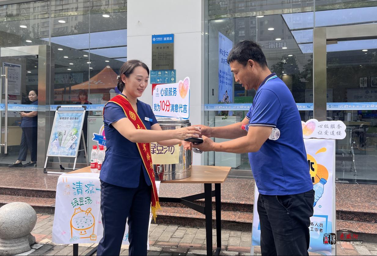 营业厅内,服务人员同样细心地为在炎热天气中前来办理业务的用户送上了绿豆汤,让这份清凉和关怀在炎炎夏日中传递。客户们脸上的疲惫被喜悦和感谢取代,这份贴心的服务为他们的夏日带来一丝凉意。