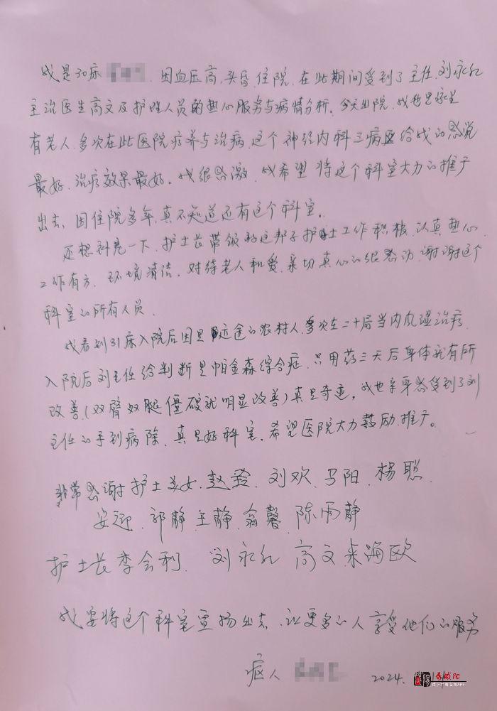 近期,咸阳市中心医院神经内科三病区(老年神经科)收到了一封来自患者崔阿姨手写的感谢信,崔阿姨63岁,患有高血压、腔隙性脑梗死、糖尿病等疾病,近来持续眩晕一月有余,入院后接受了调整血糖、降低血脂、改善睡眠及眩晕症状等综合性治疗,眩晕症状很快缓解,出院之际崔阿姨连声道谢。