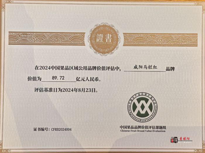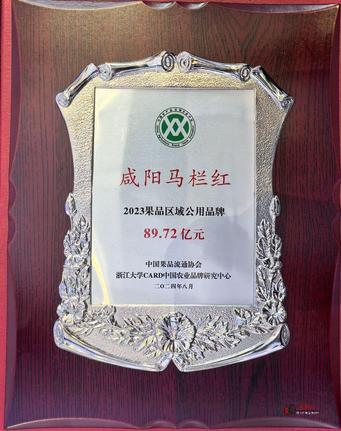8月23日品牌盛典环节,中国果品流通协会和浙江大学CARD农业品牌研究中心经过消费者评价调查、海量数据整理和分析,形成评估结果,浙江大学中国农村发展研究院发布了“2023 果品区域公用品牌价值 ”等榜单。“咸阳马栏红”苹果价值以89.72亿元,位列“2023年中国果品区域公用品牌价值榜”第4位,全国苹果品牌仅次于烟台苹果、延安苹果位列第三,年增长13.56亿元,增长率达17.80%,位于区域公用品牌增长第一位。
