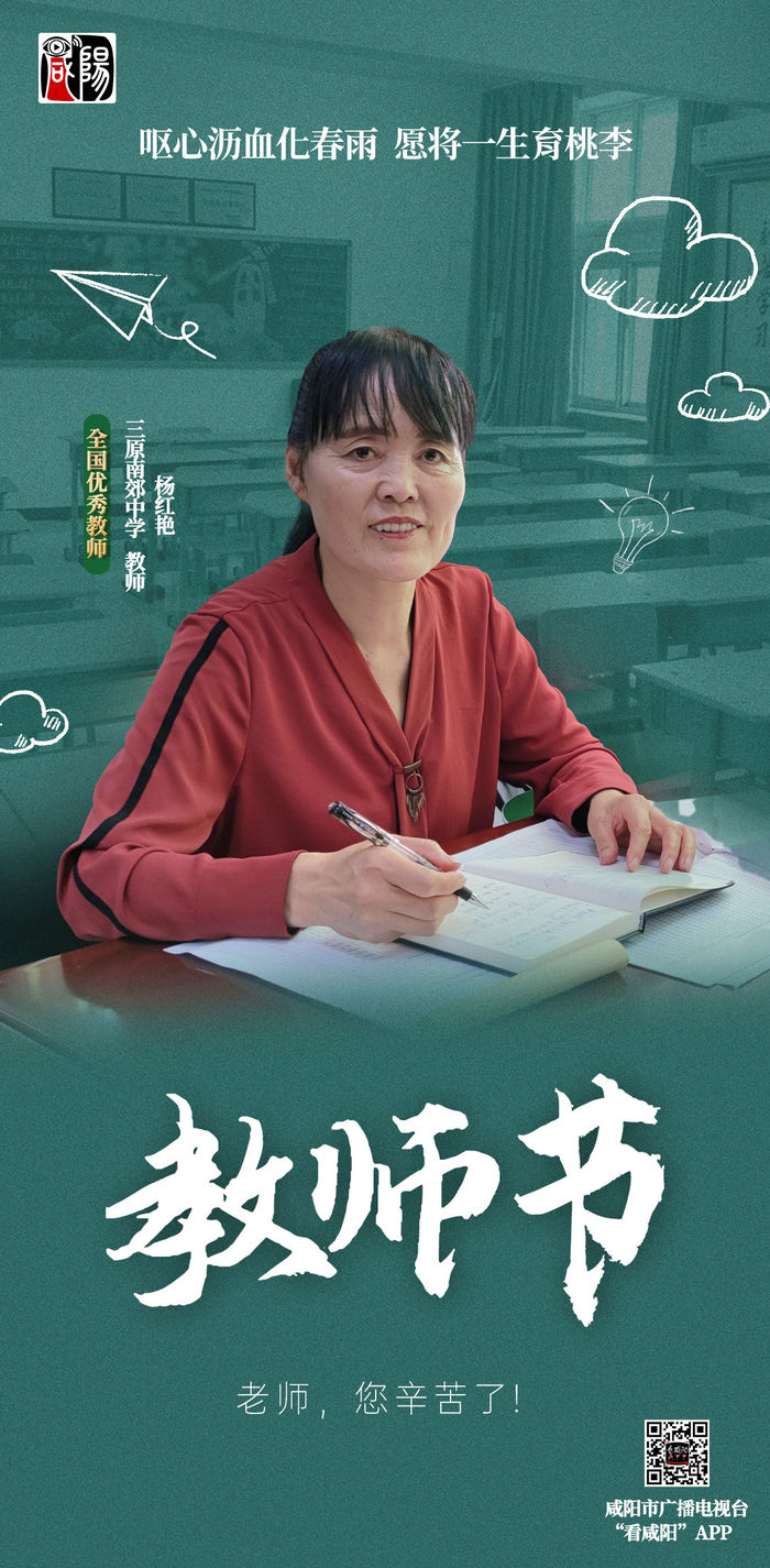 杨红艳,三原南郊中学正高级体育教师。先后荣获全国优秀教师、陕西省教书育人楷模、陕西省特级教师、感动陕西教育“最美教师”、陕西省“五一巾帼标兵” 、陕西省“三八红旗手”、陕西省基础教育教学名师、陕西省“体育名师”。自2005年至今已连续20年被三原县政府授予“高考优秀班主任”称号。这一个个称号、一张张证书是荣誉,更是信任,是付出,更是责任。呕心沥血化春雨,愿将一生育桃李。这就是杨老师最质朴的情怀。