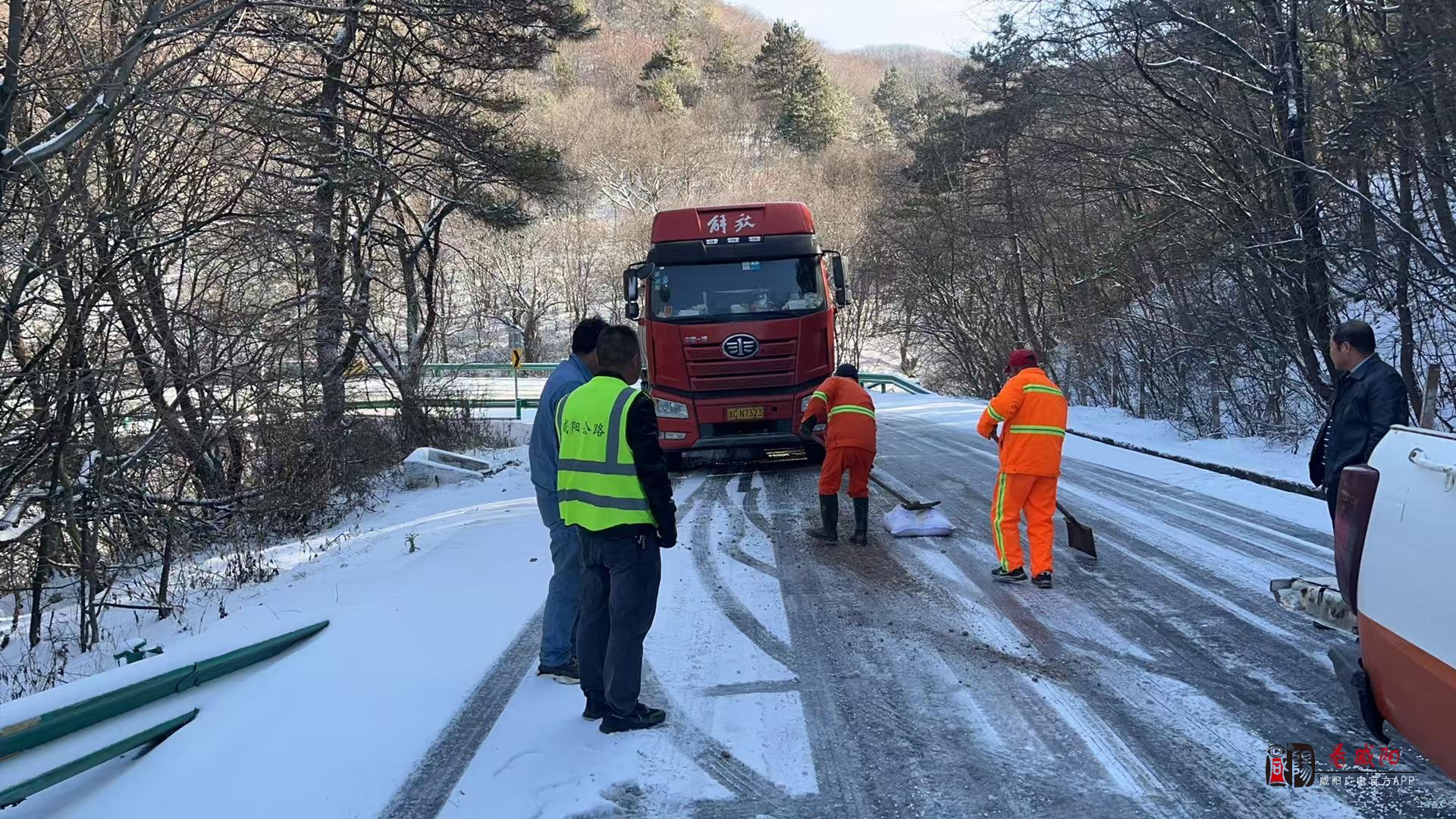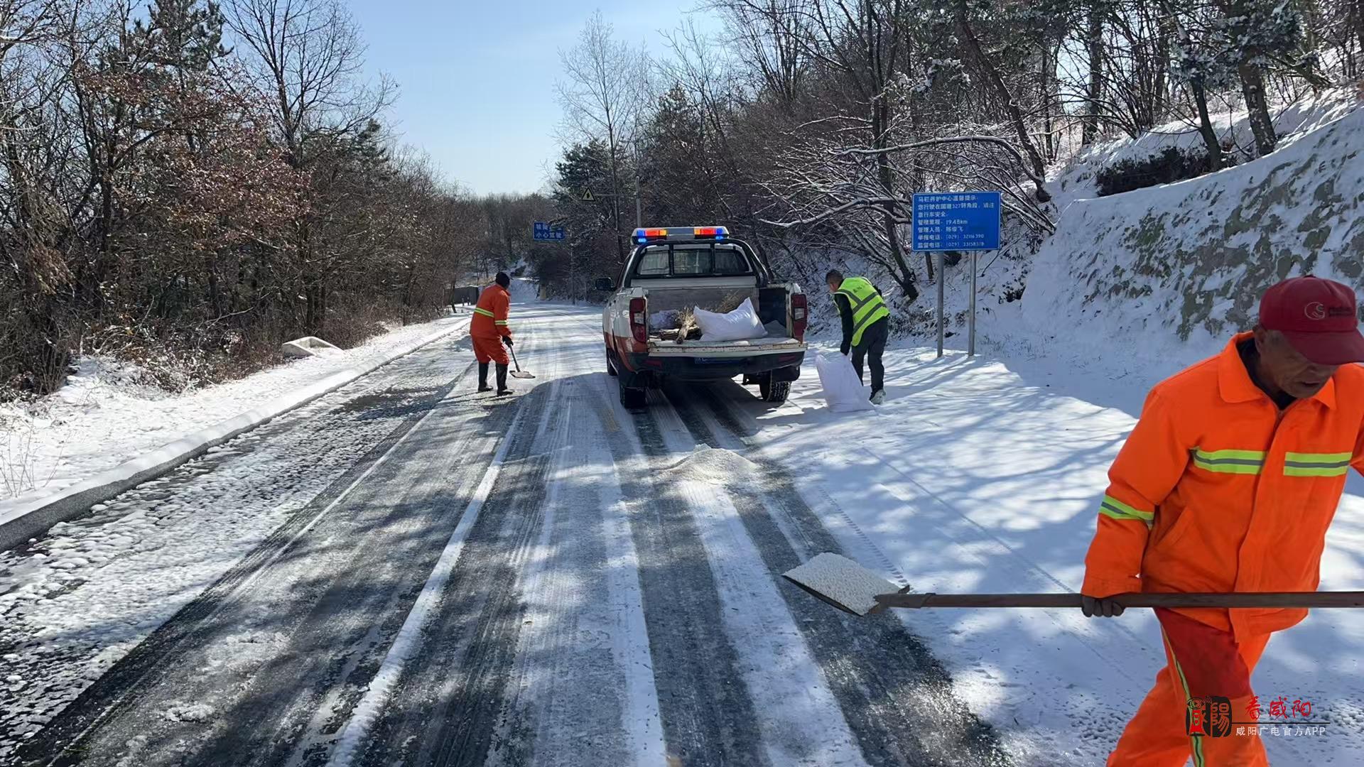 《看咸阳》讯:11月24日夜间,咸阳市马栏地区气温骤降并伴有小雪天气,25日凌晨,该区域内的327、342国道等路段不同程度段出现积冰、积雪,为了确保道路安全畅通,咸阳市公路局马栏养护中心立即启动《防滑保畅应急预案》,迅速组织全体人员上路除冰除雪。