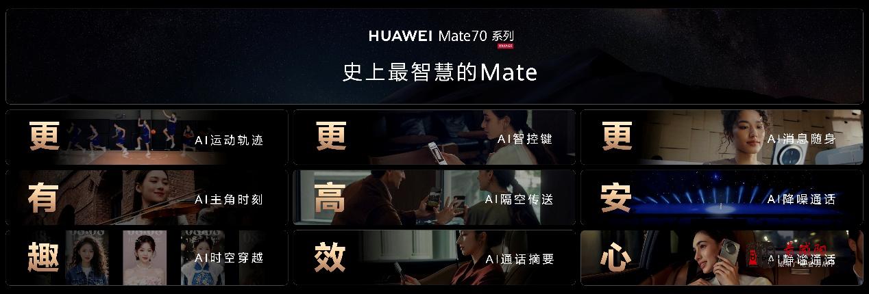除了强悍的性能和卓越的通信能力,华为Mate 70系列还在影像和AI功能体验方面迎来重大突破, 业界首发红枫原色摄像头,精准还原色彩,记录真实所见。同时,依托于AI电影质感引擎,其视频能力也迎来跨越式提升。而在AI功能体验上,华为Mate 70系列基于软硬端云协同的技术底座,首发AI运动轨迹、AI隔空传送、AI消息随身等九大创新AI功能,为用户提供了更有趣、更高效、更安心的智慧体验。