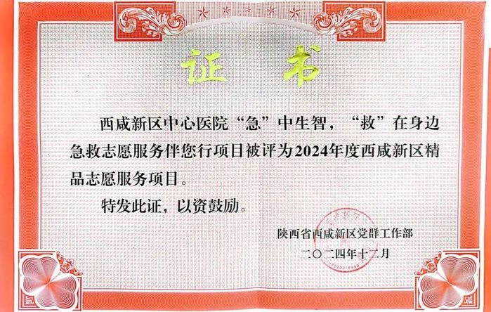 《看咸阳》讯:近日,陕西中医药大学第二附属医院“急”中生智,“救”在身边 —— “急救志愿服务伴您行”急救志愿服务项目荣获西咸新区精品志愿服务项目。