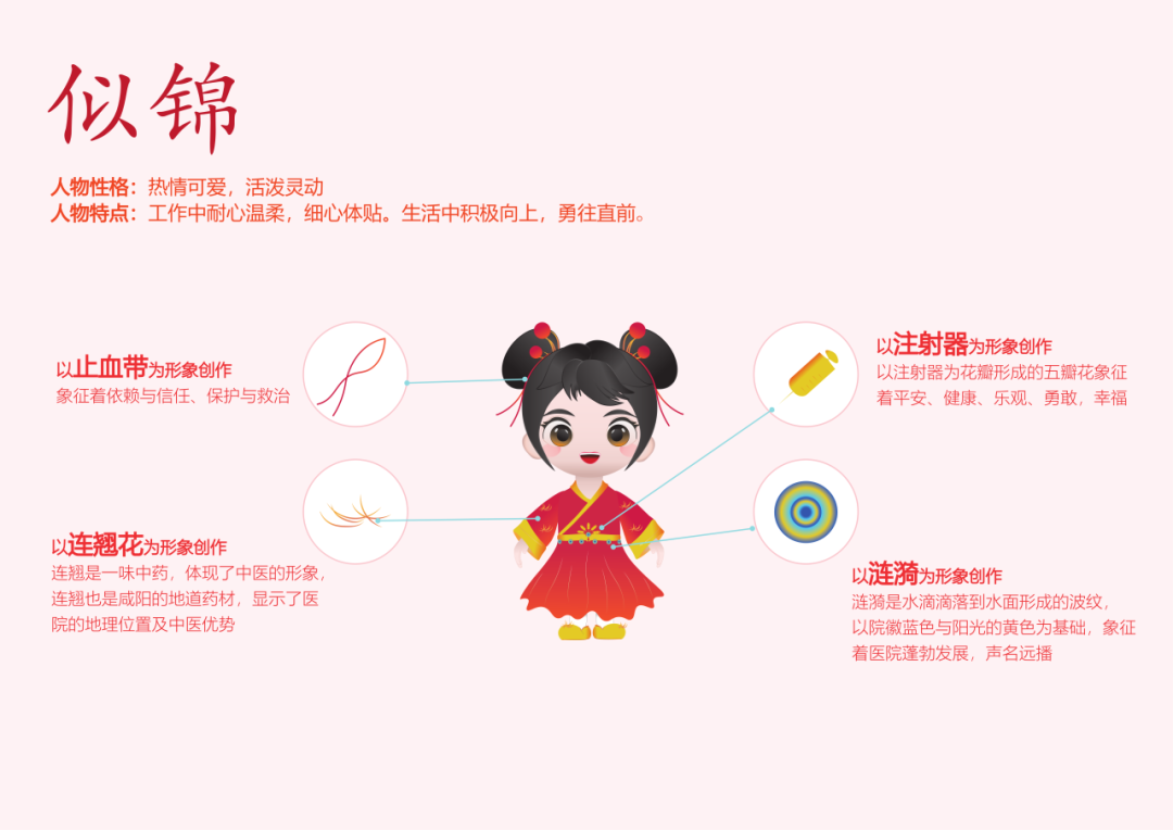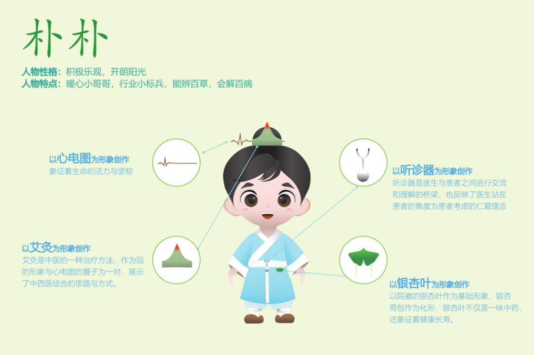 “朴朴”以心电图、听诊器、艾灸、银杏叶为形象创作灵感。“似锦”以止血带、注射器、连翘花和涟漪为形象创作。这两个可爱的卡通形象,仿佛是从中医药的奇妙世界里跳跃而出的精灵。它们的设计巧妙地融合了医院的特色与亲和力,正面、侧面、背面的形象都萌趣十足,让人看一眼就难以忘怀。