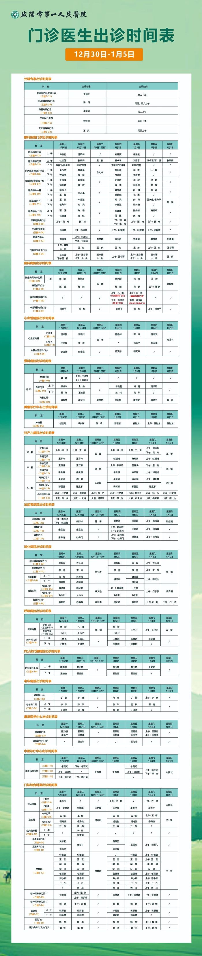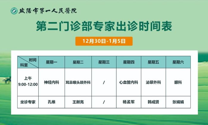《看咸阳》讯:为方便群众就医,及时了解门诊医生出诊情况,咸阳市第一人民医院及第二门诊部2024年12月30日至2025年1月5日的门诊医师出诊表新鲜出炉,请及时查看并合理安排就诊时间。